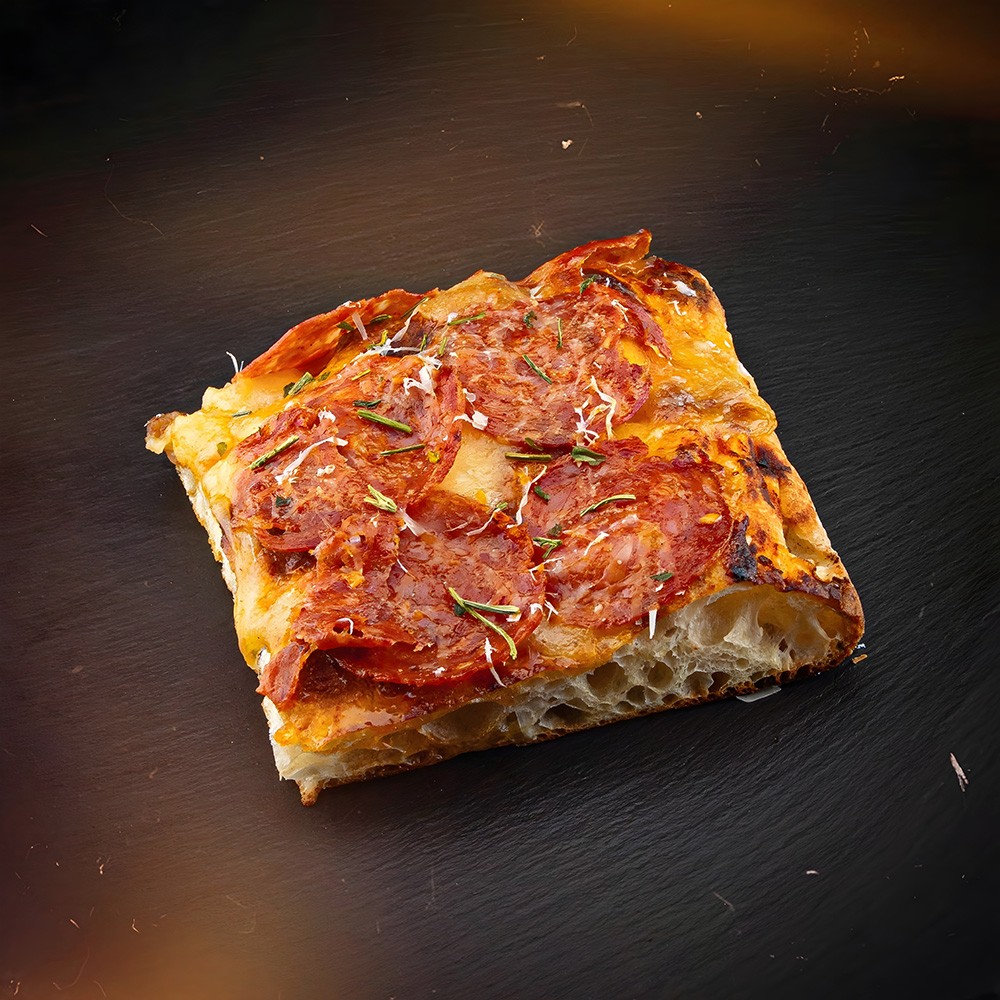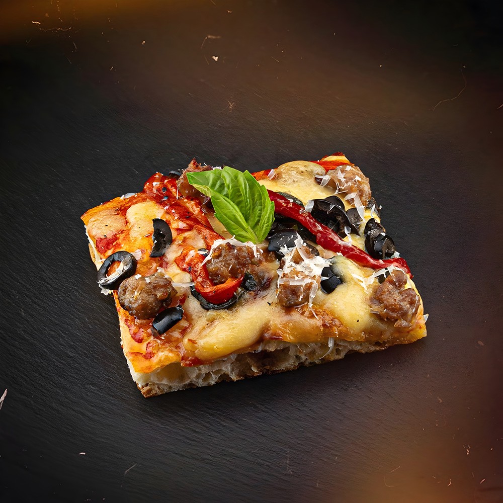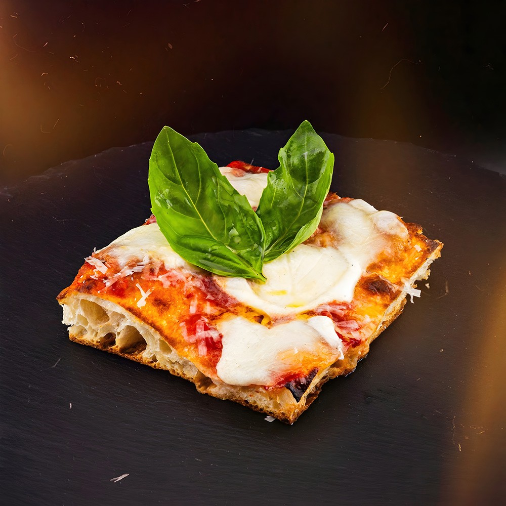 Our unbeatable Roman pizza, square, crispy, fluffy, topped with the best Italian ingredients.