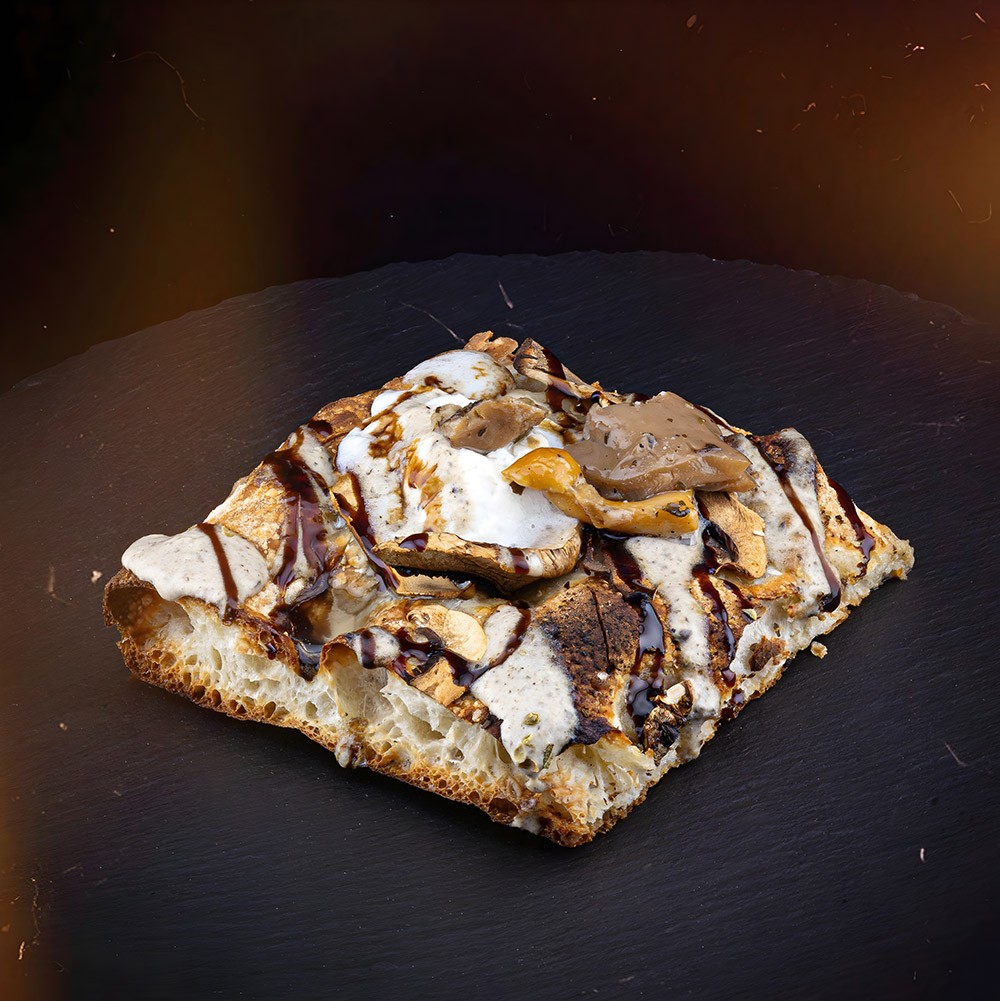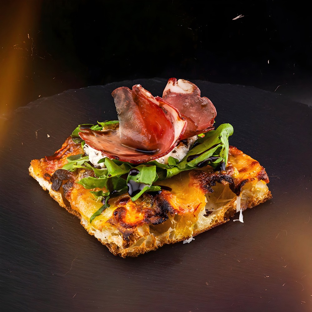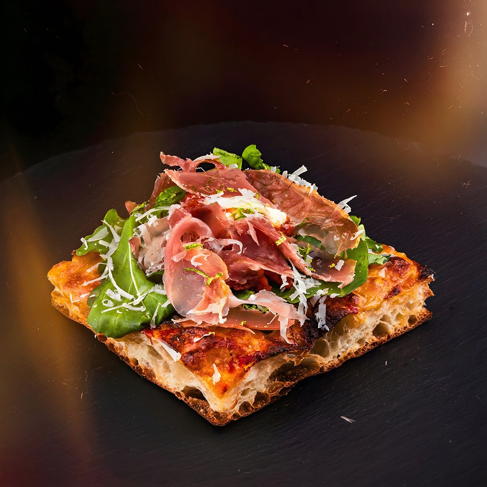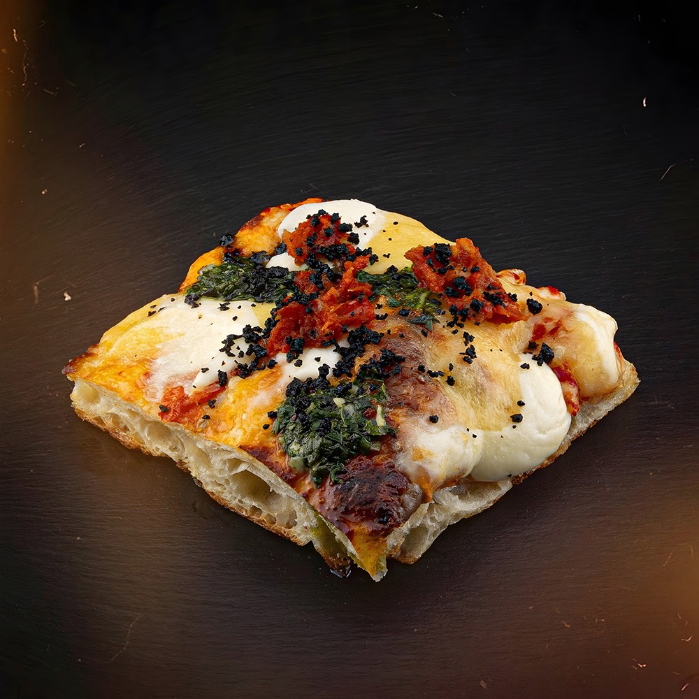 Our unbeatable Roman pizza, square, crispy, fluffy, topped with the best Italian ingredients.