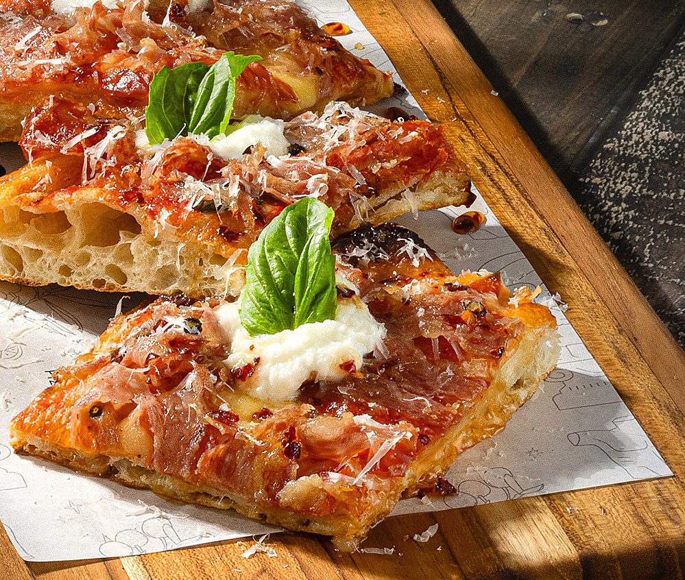 Our unbeatable Roman-style pizza in teglia, square, crunchy, and fluffy, topped with Italian ingredients.