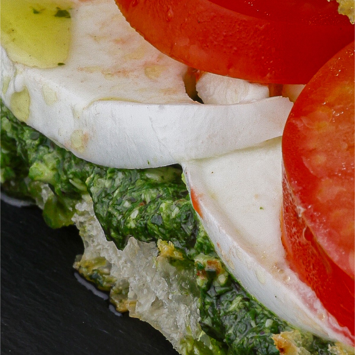 Roman focaccia filled with pesto, fresh mozzarella cheese, fresh tomato, and extra virgin olive oil.