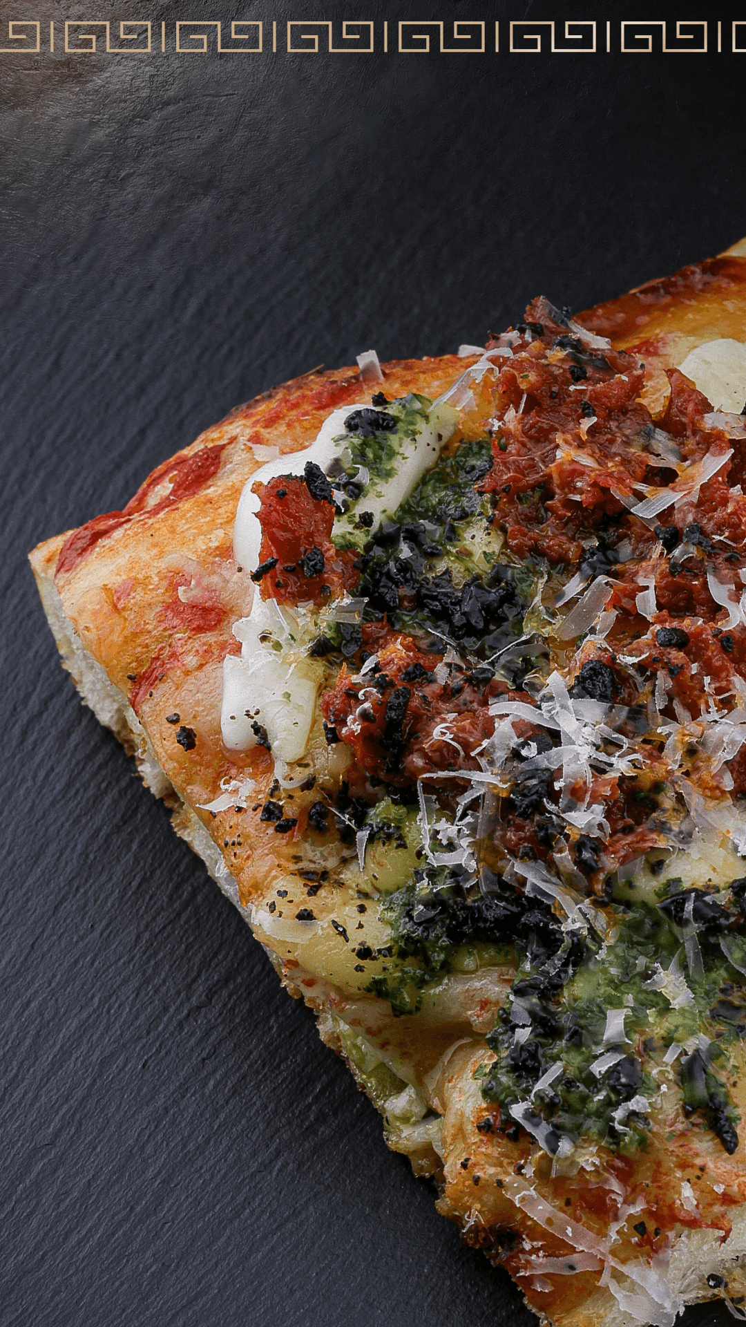 Roman pizza topped with cherry tomatoes, fresh mozzarella cheese, fresh pesto, sun-dried tomatoes, and black olive soil.