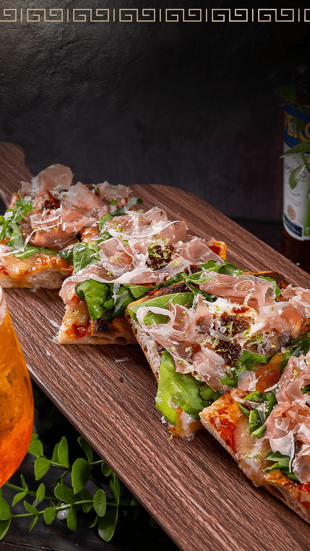 Roman-style pizza topped with a base of cherry tomatoes, straciatella, prosciutto, arugula, lemon zest, extra virgin olive oil, and Grana Padano cheese.