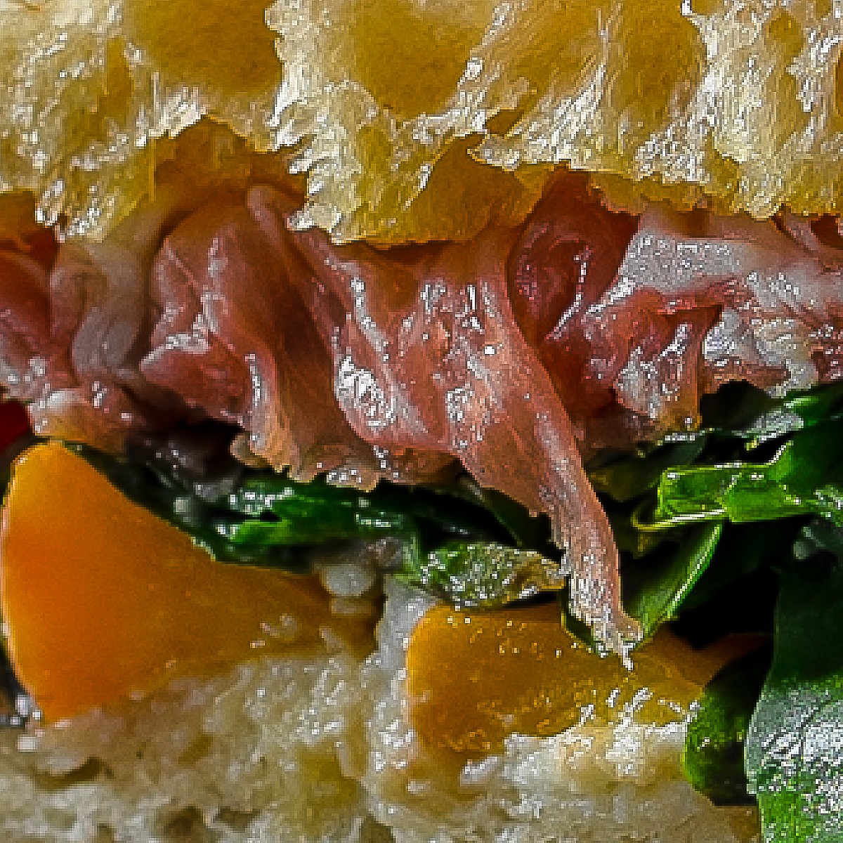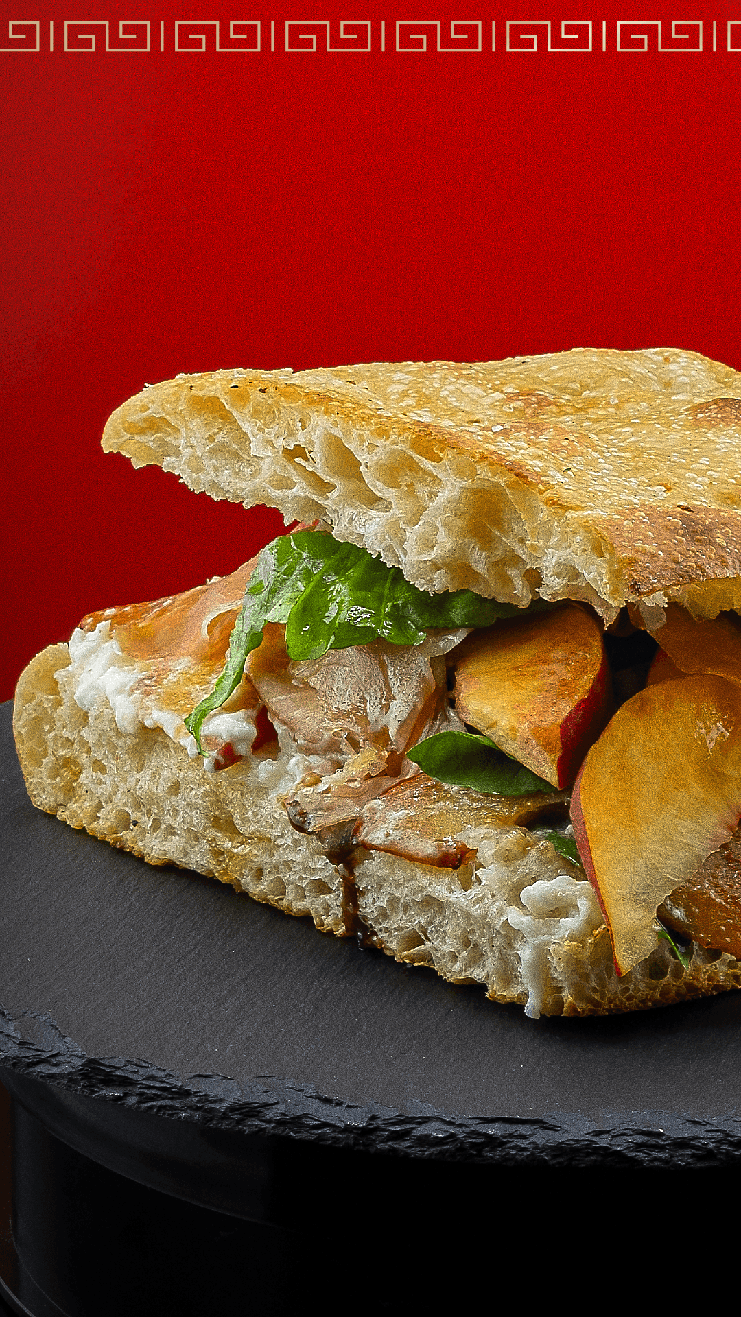 Focaccia romana rellena de Prosciutto di Parma, melocotón asado, stracciatella, albahaca y arúgula fresca, reducción de vinagre balsámico.